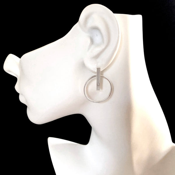 These Clem Earrings feature a minimal design with a diamond flush set into each long bar with a thick hoop surrounding it. The diamonds appear to float, adding the perfect amount of subtle sparkle!